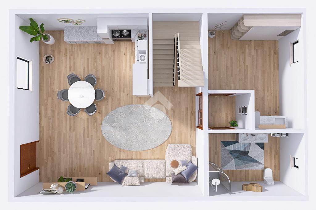 Superata la corte, dove abbiamo un posto auto scoperto di proprietà, abbiamo la porta d'ingresso dell'abitazione. Accediamo quindi alla zona giorno con cucina open space, al bagno e alla zona lavanderia, mentre al piano primo si colloca la zona notte.