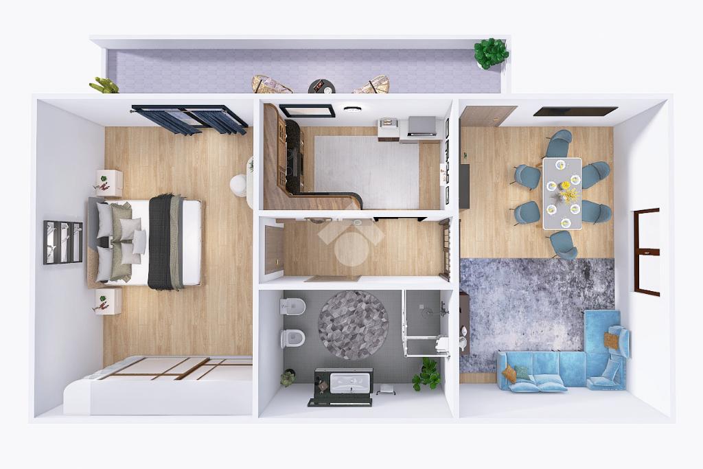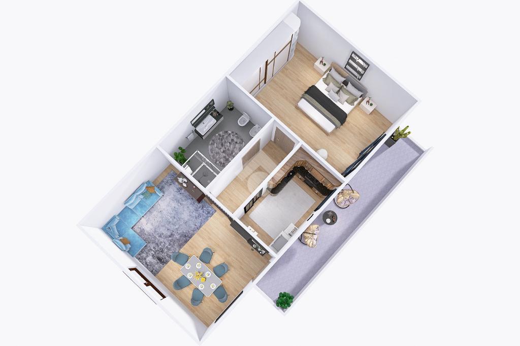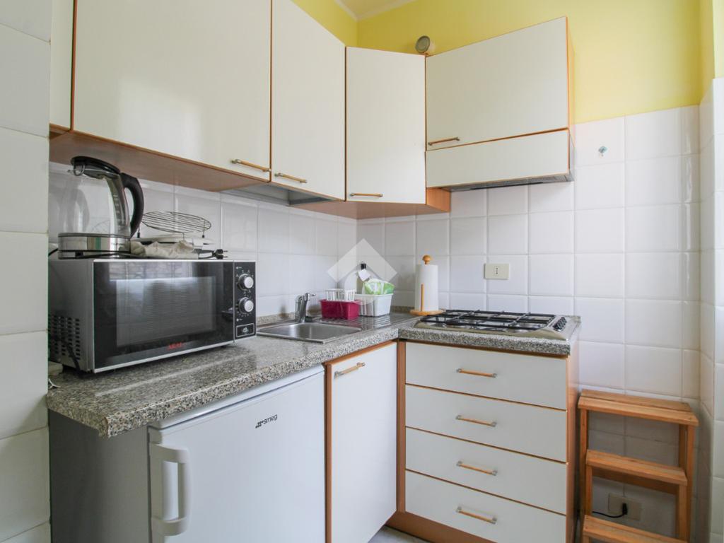 L'appartamento è composto da: una spaziosa camera matrimoniale finestrata, un salotto luminoso con divano letto, un cucinotto funzionale e un bagno con doccia.